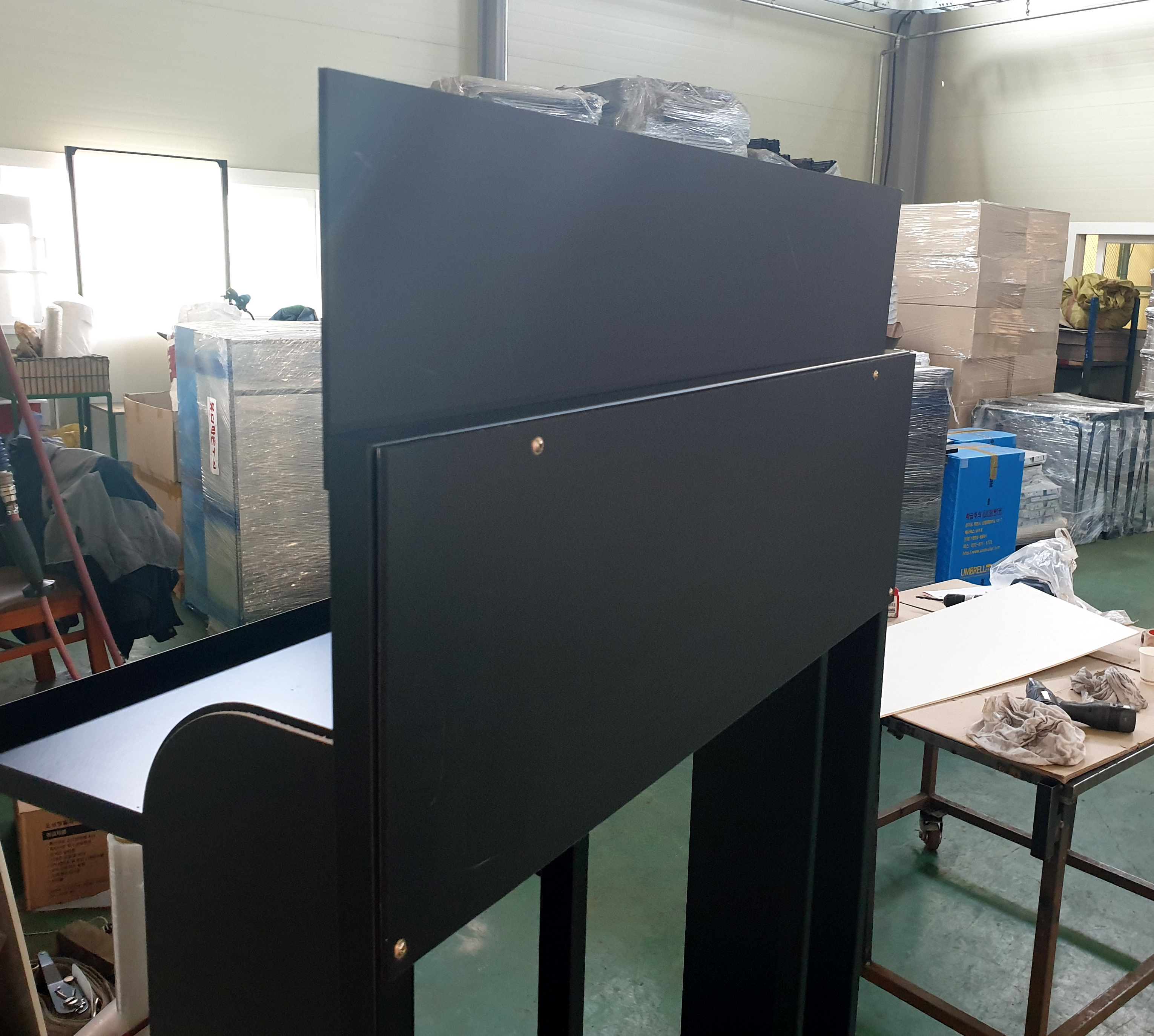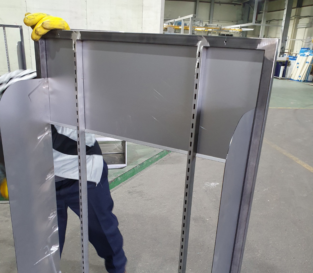 -재단, 용접 작업이 완료된 철재 프레임 구조 검토와 선반 조립, 도어 조립 및 구동 테스트.