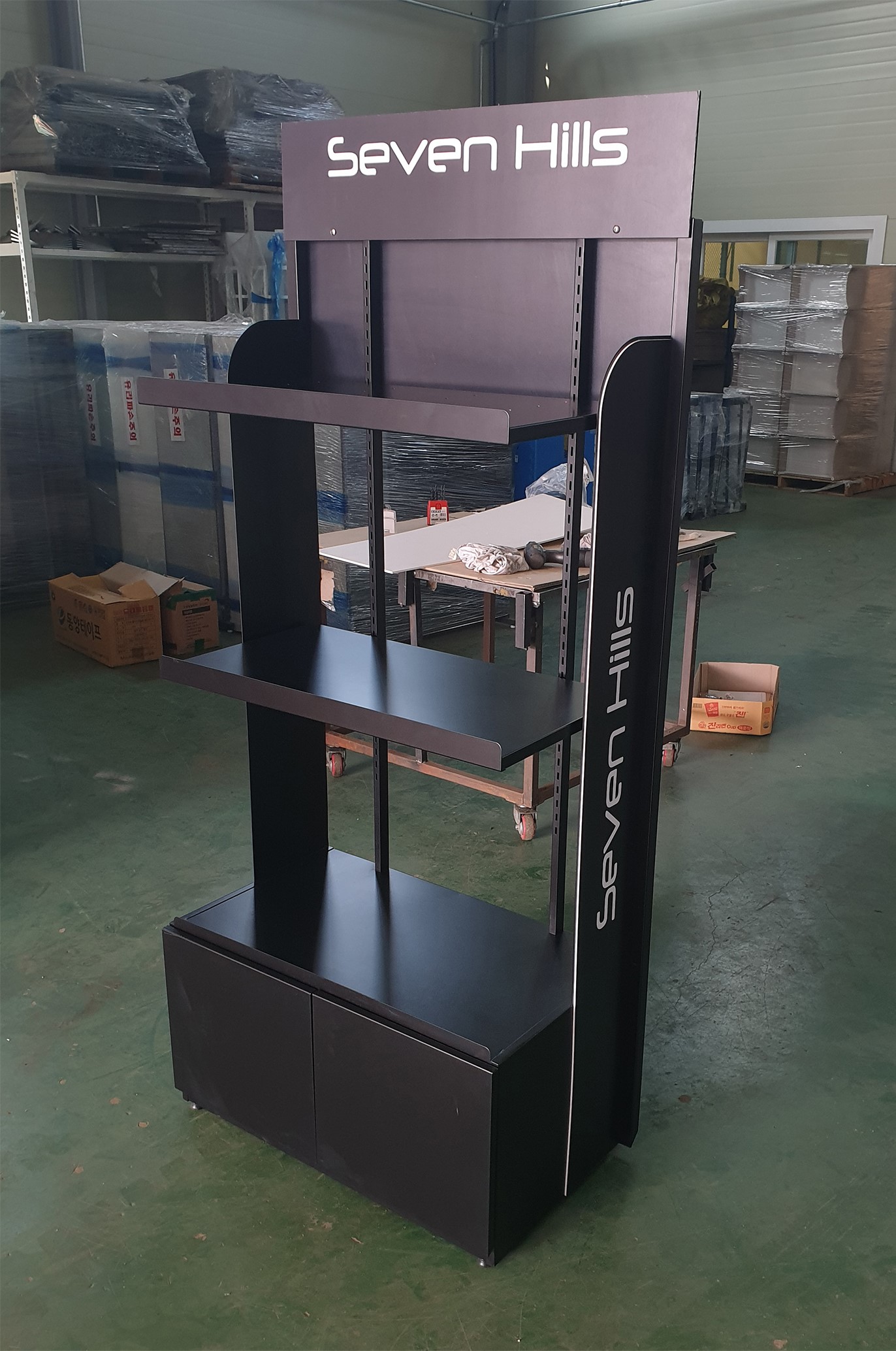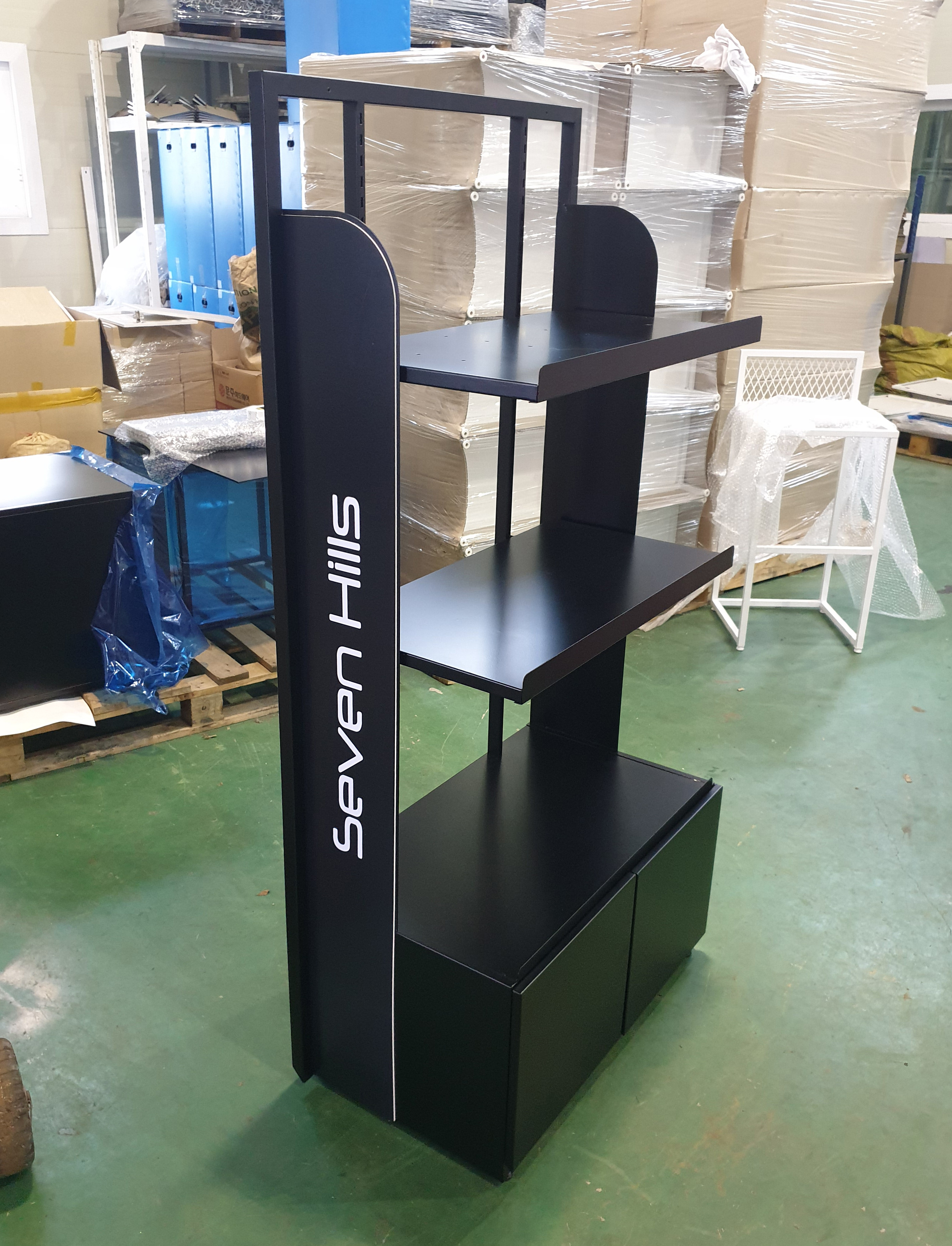 -진열대 구조에 도장과 그래픽 사양, 조립 부자재 등을 적용하여 제작 완료 상태 미리보기.