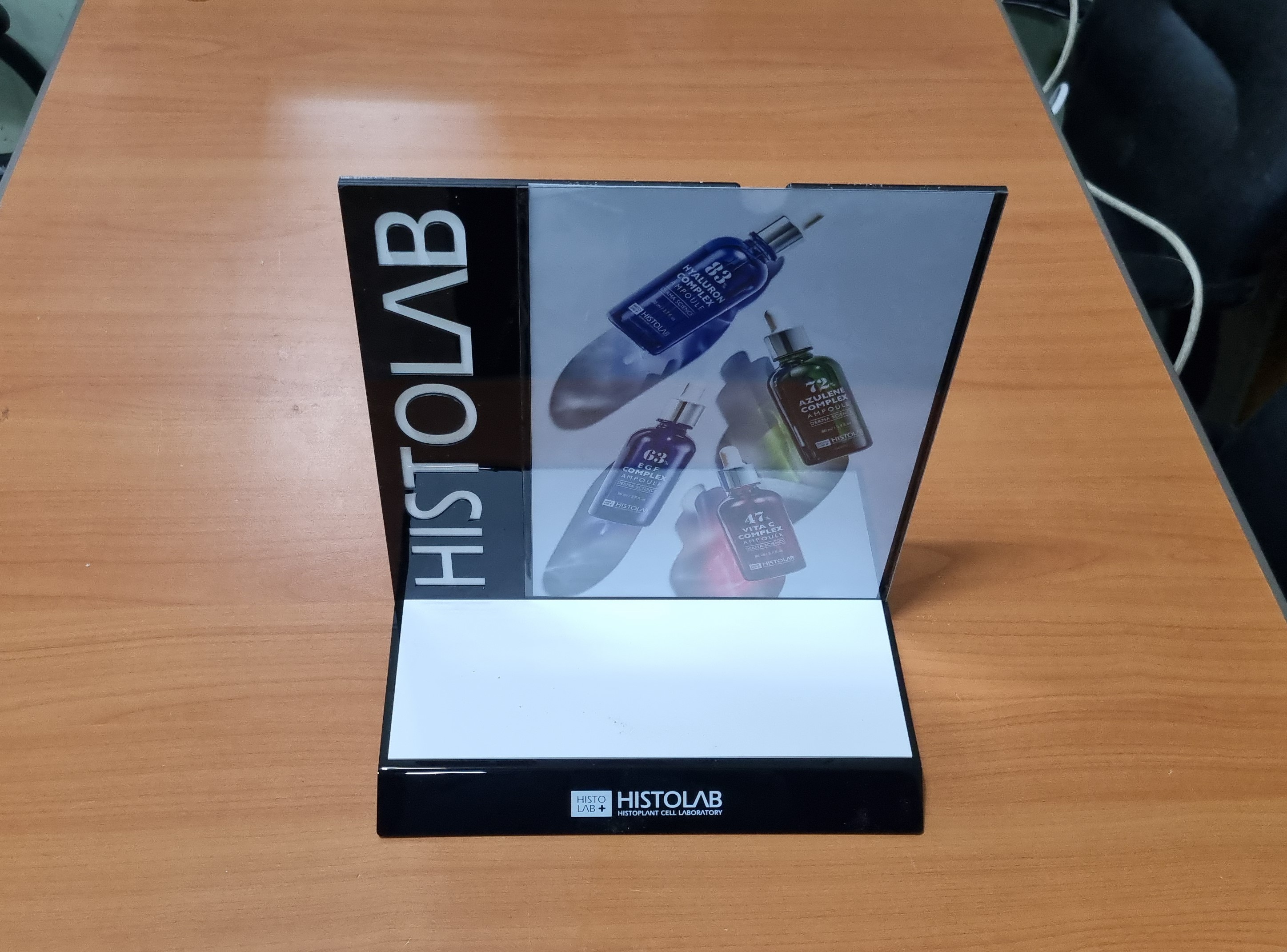 -제작 완료된 히스토랩 에스테틱 화장품 전시 집기 샘플.