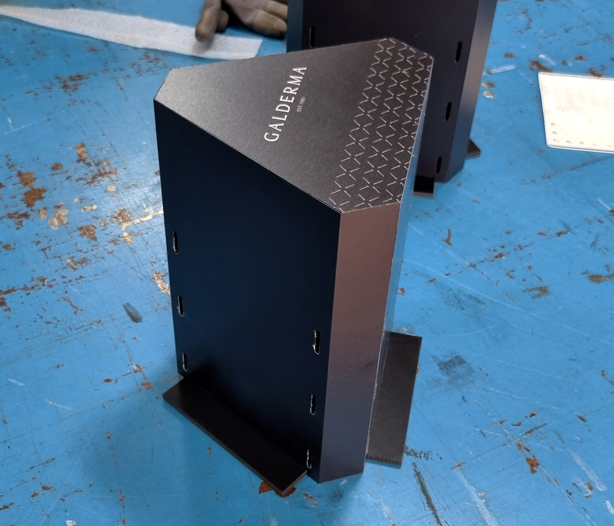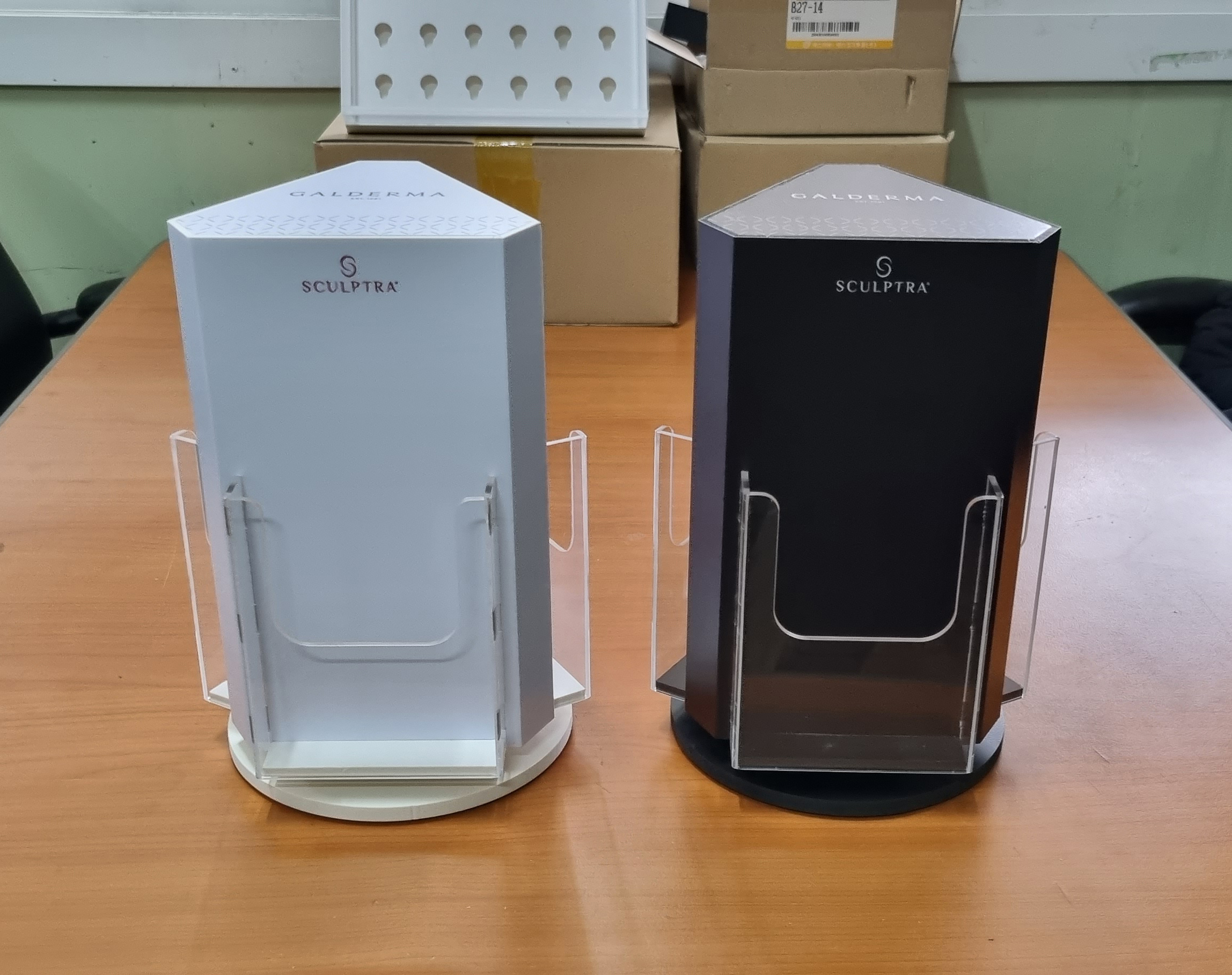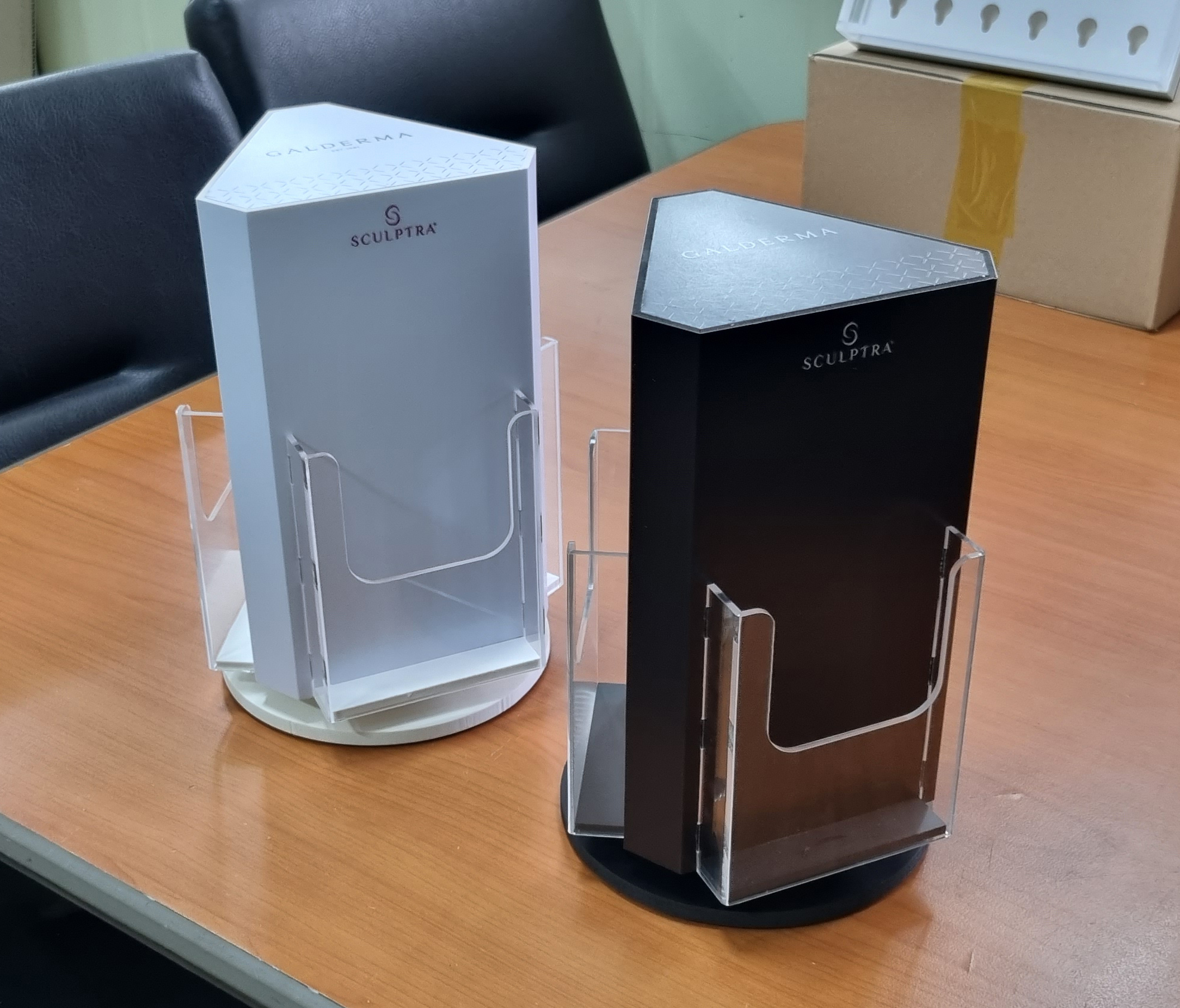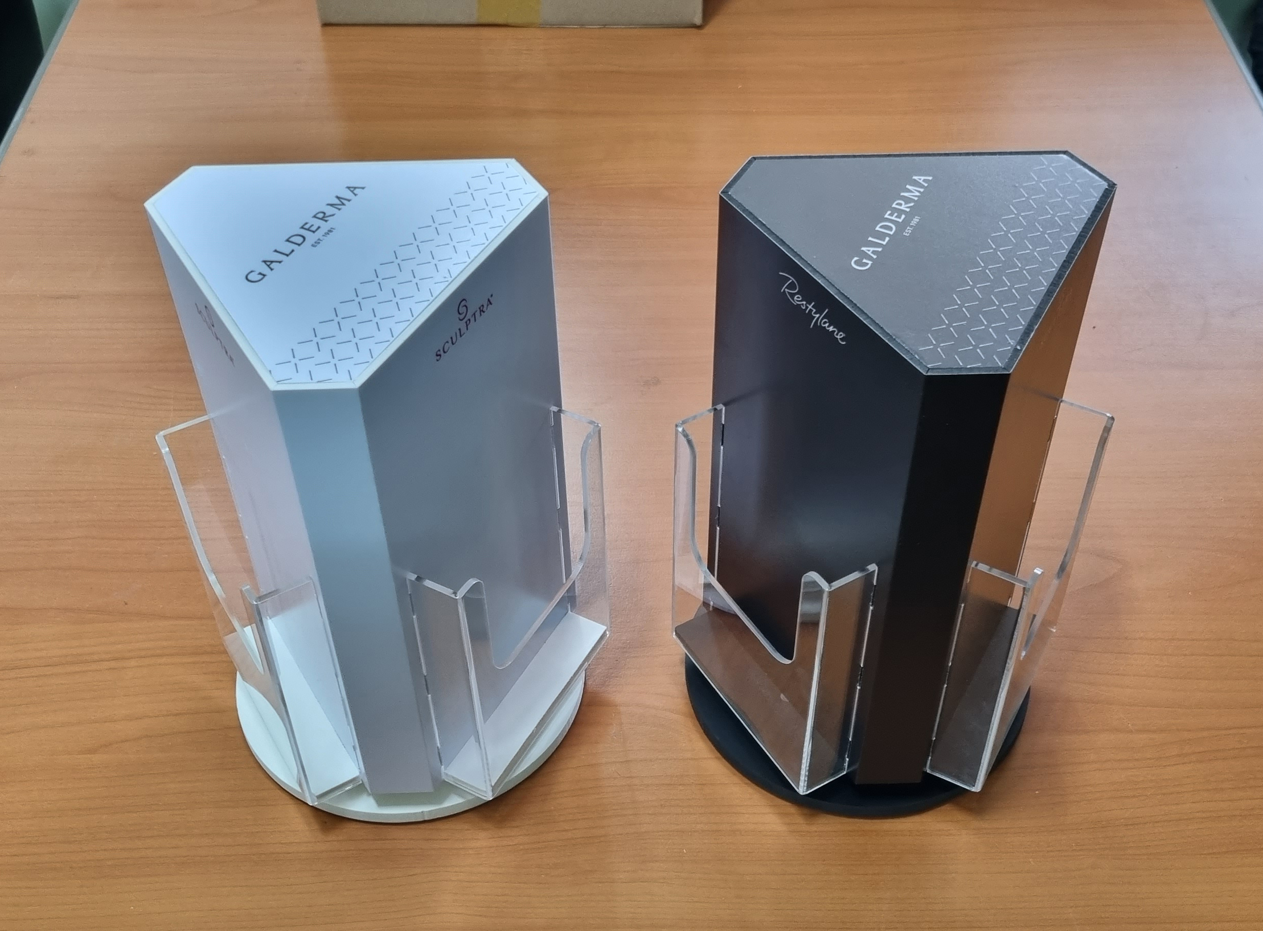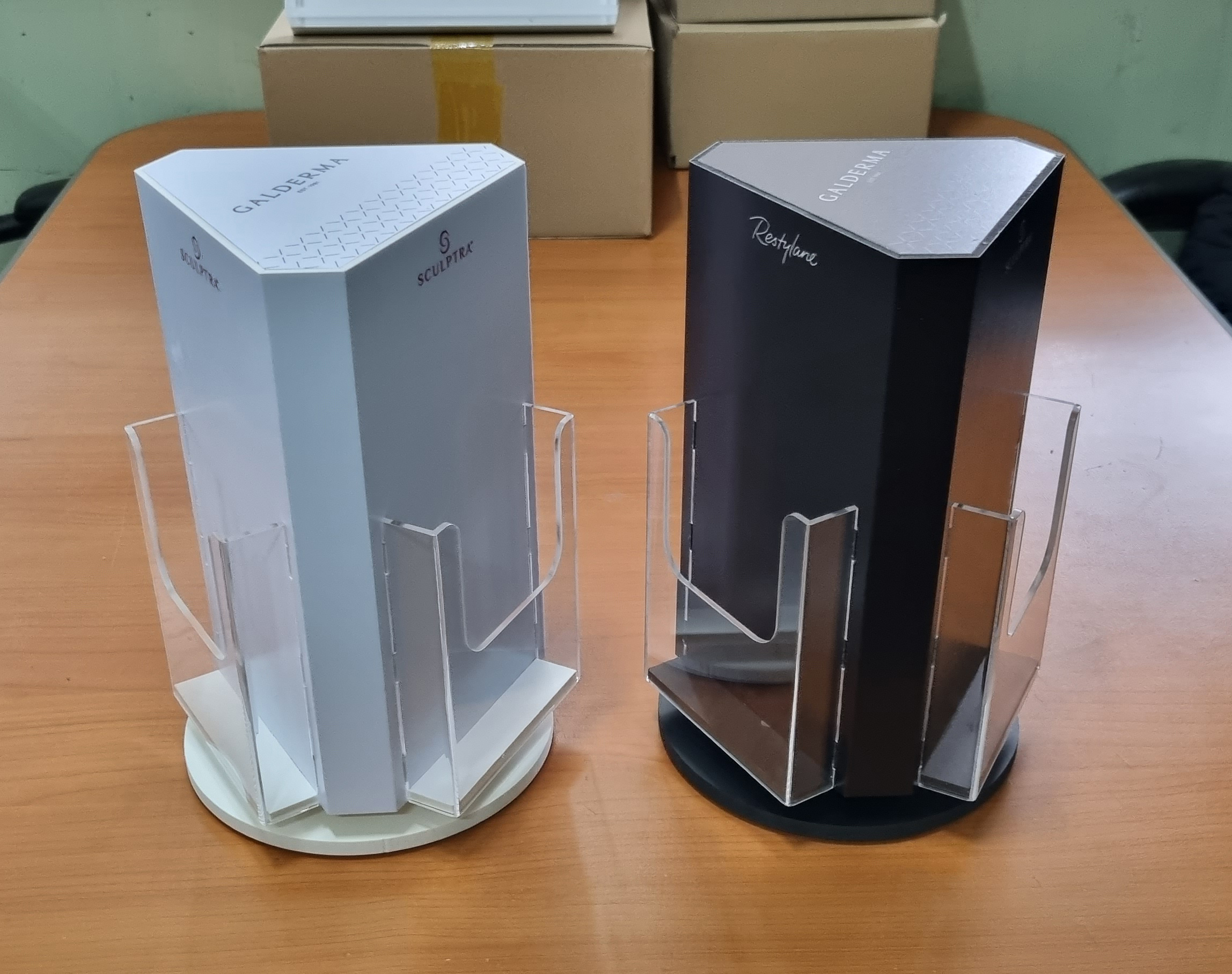 -완성된 갈더마 회전형 3면 브로슈어 거치대는 개별 래핑 및 단위 박스 포장 완료.