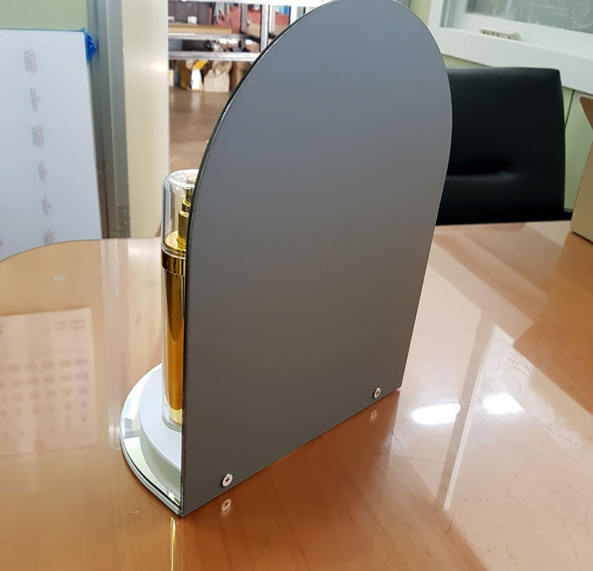 -실버 미러 아크릴을 메인 소재로 적용한 디자인 시안 채택 후 샘플 제작 및 양산 진행.