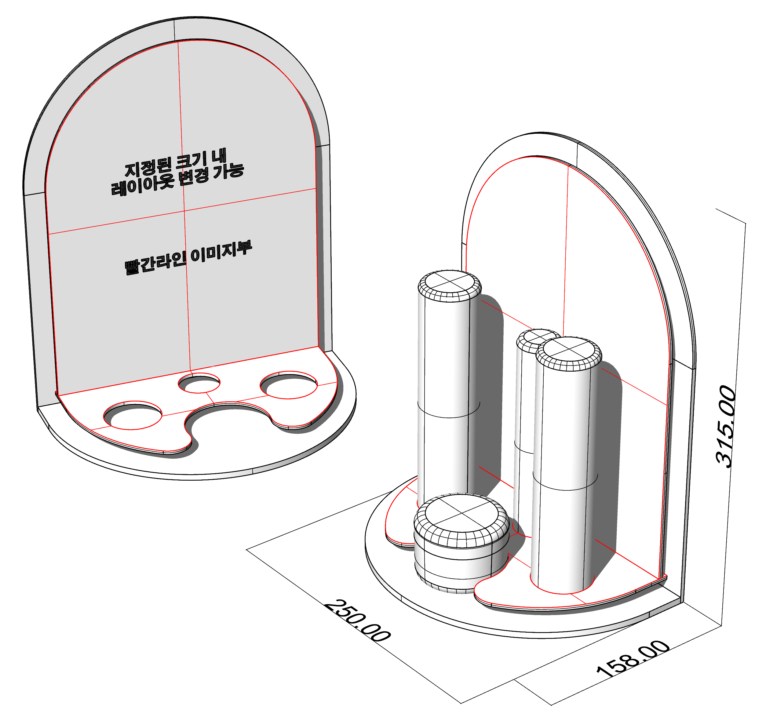 -원기둥 형태의 화장품 패키지 거치 방식 개발 (실측 데이터를 기반으로 타공 및 삽입 방식 적용).