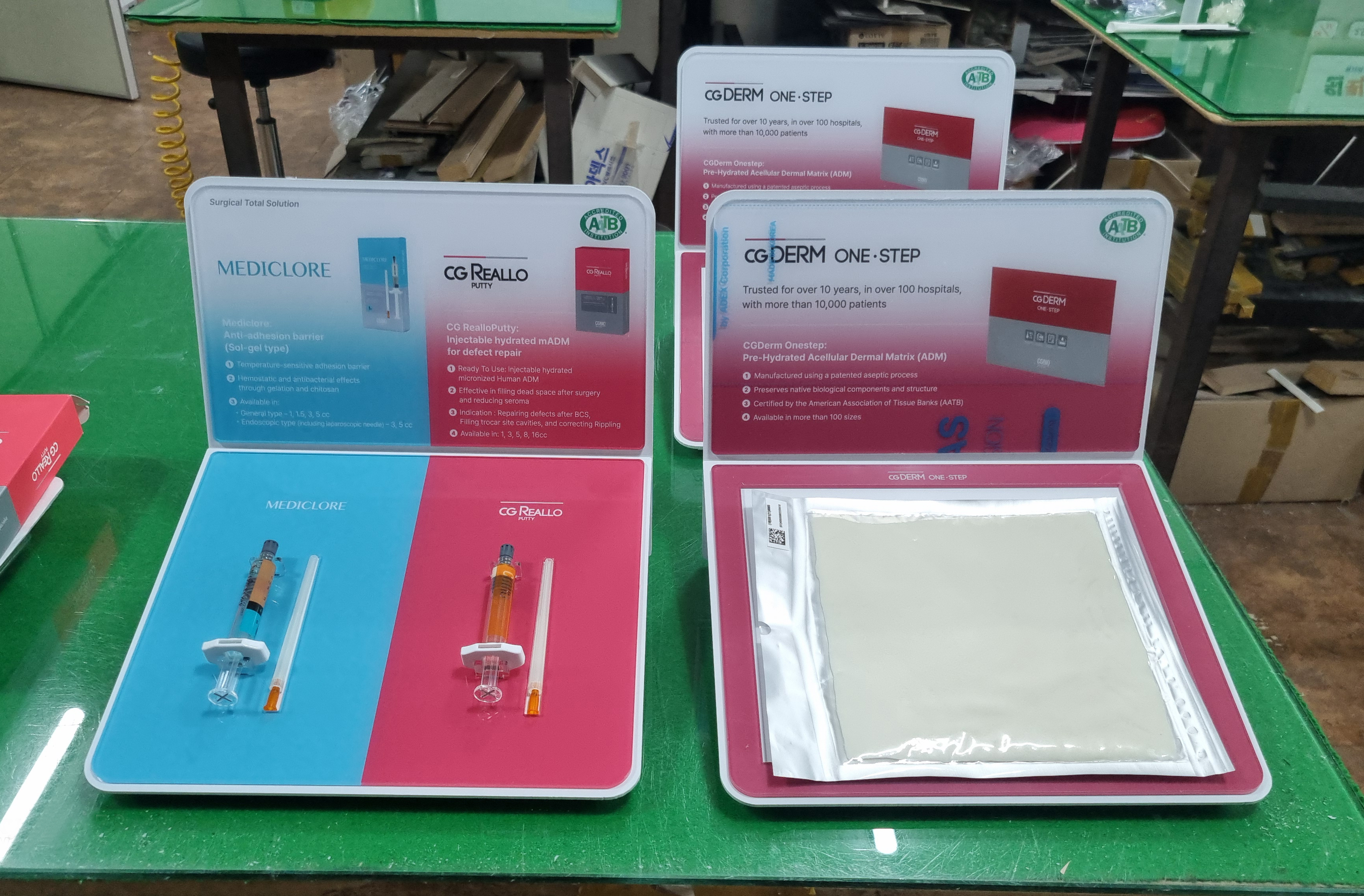 -시린지 2종과 패드 형태의 의료기기 전시 VMD 구분하여 구성.