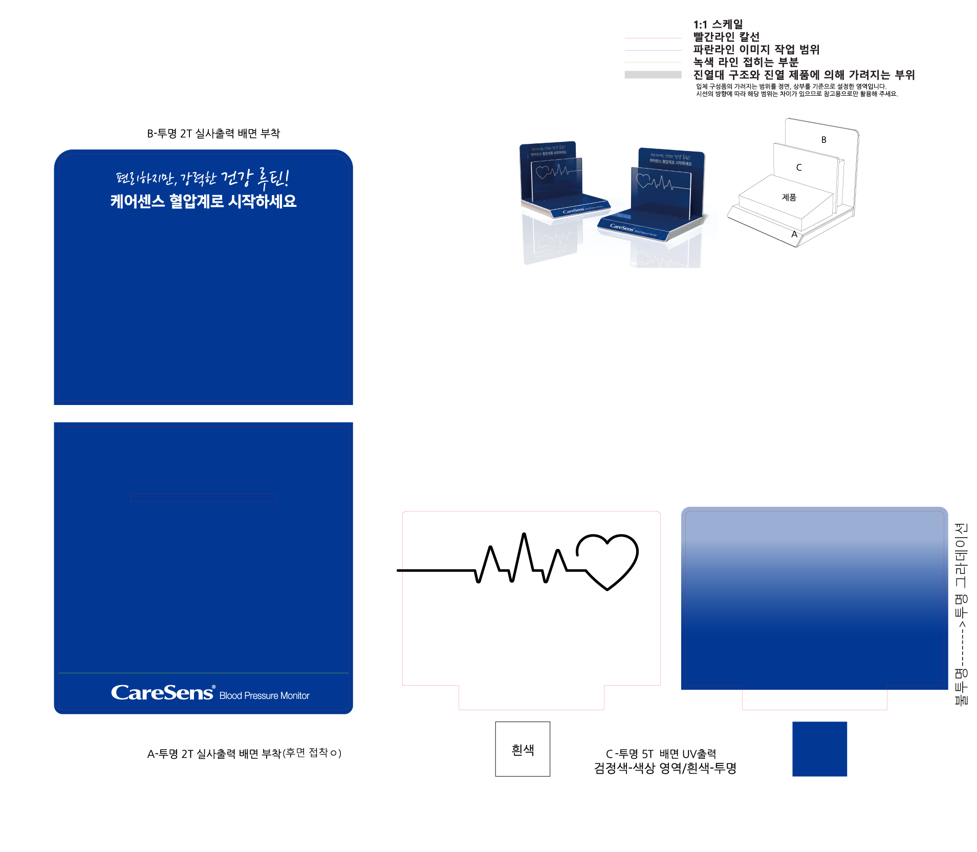 -고객사에서 제공한 디자인 초안과 진열 상품(혈압계+부속) 샘플을 기준으로 카운터용 피오피 제작 요청.