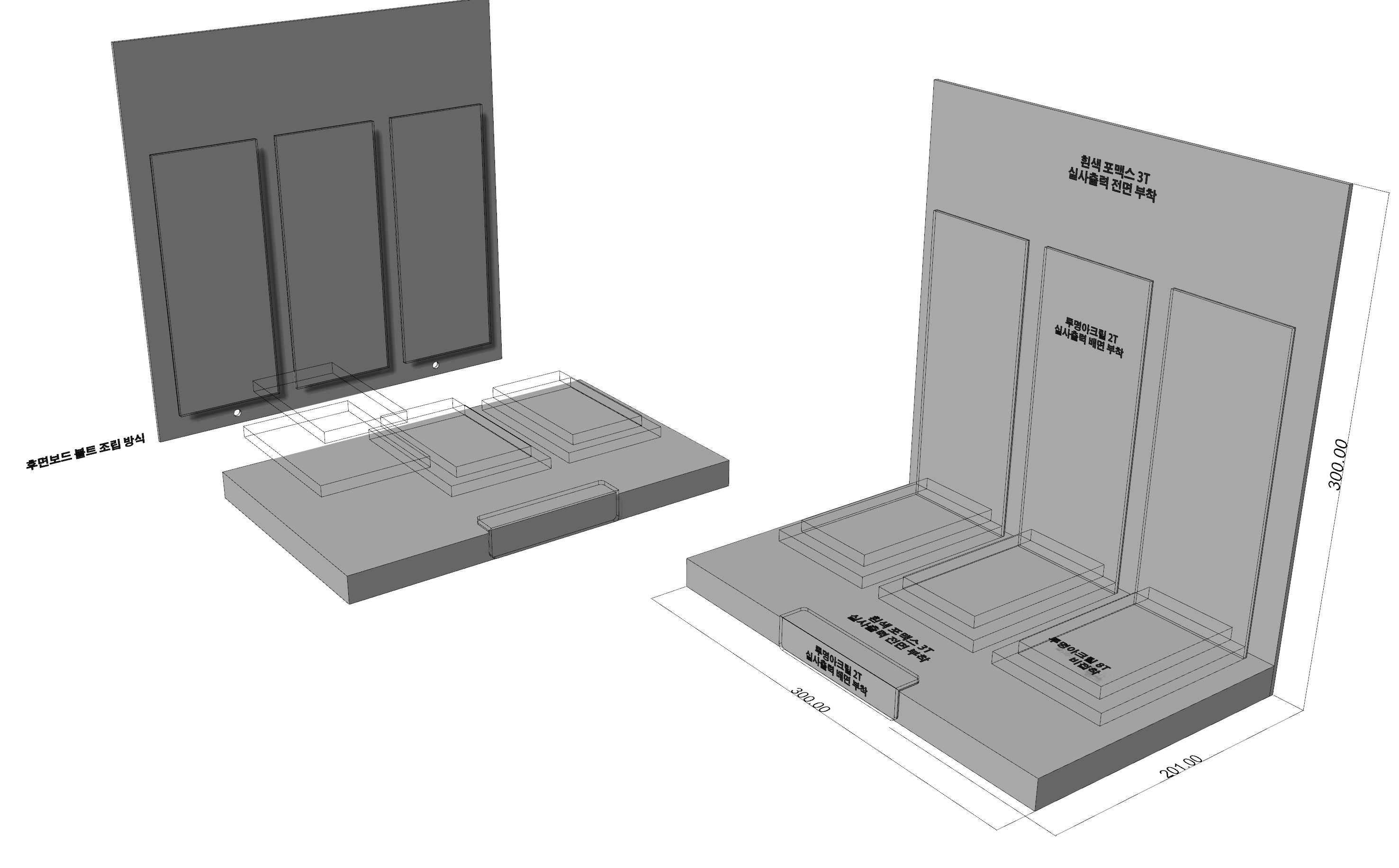 -상품 진열부 방식과 진열대 활용 방식을 고려하여 비접착 방식의 투명아크릴 2단 블럭 구성.