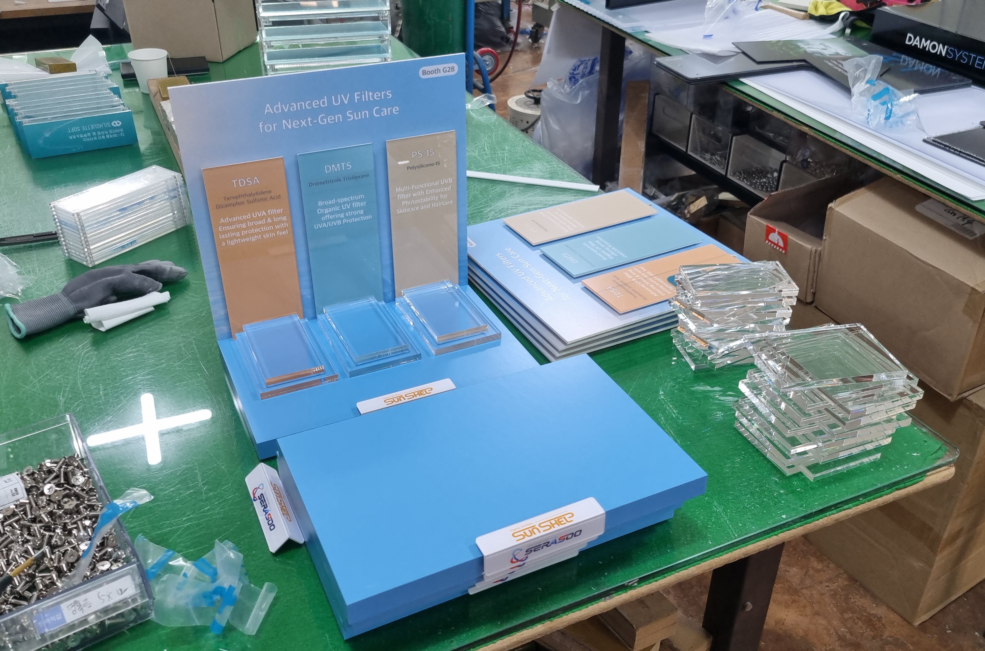 -디자인 초안에 상담 중 확인, 협의된 내용을 반영하여 생산 효율성이 개선된 화장품 진열대 구조 제안.
