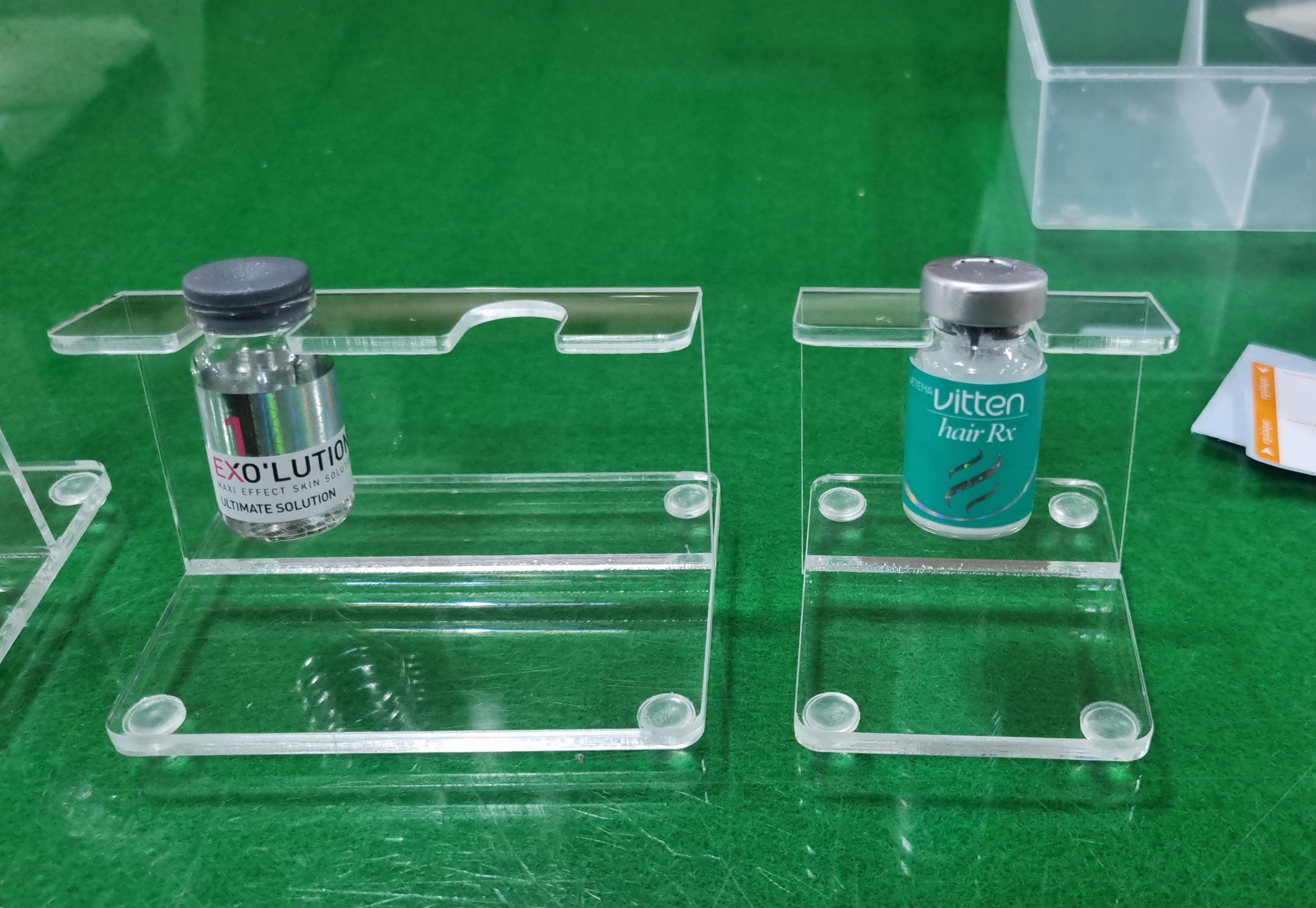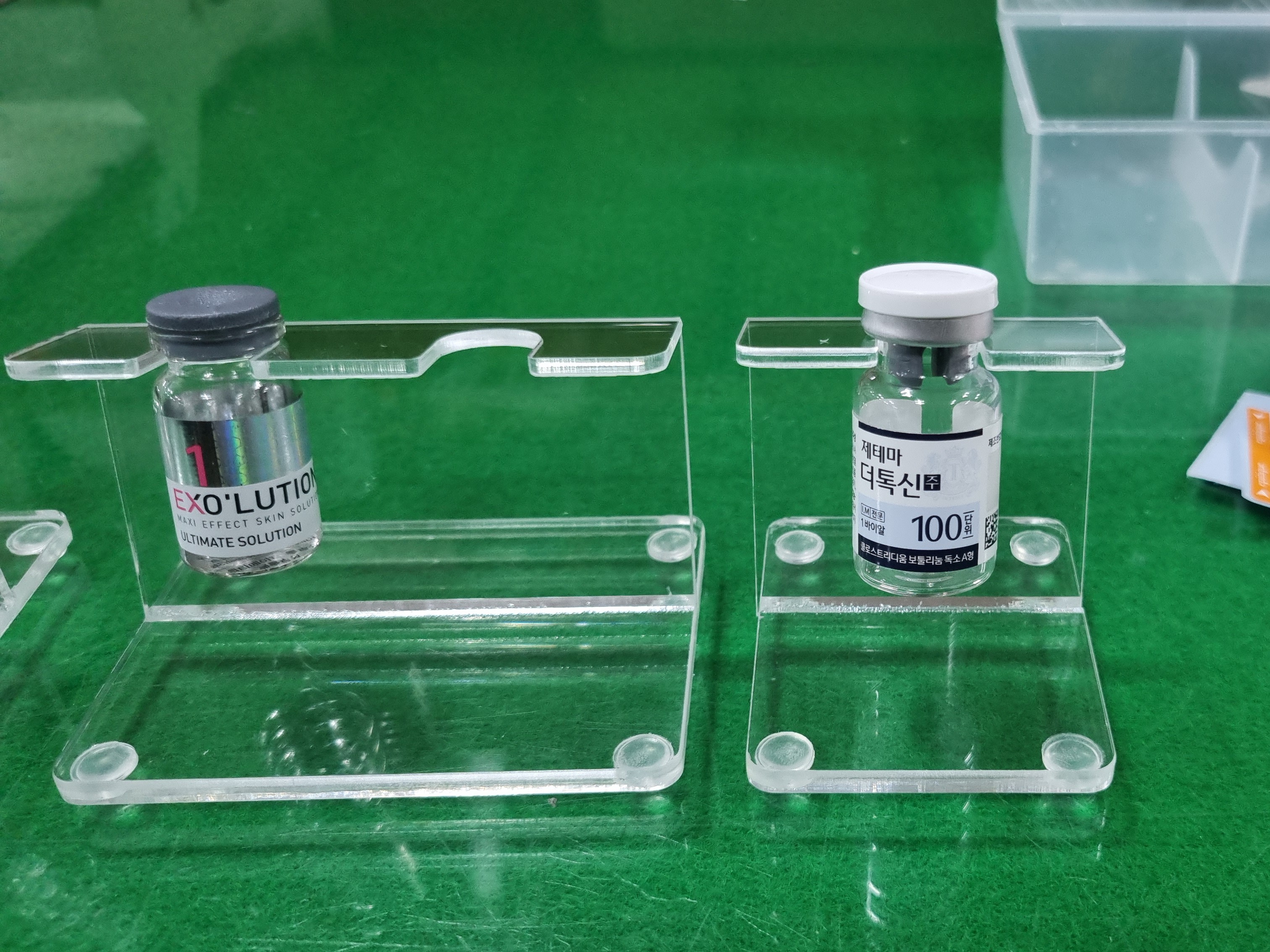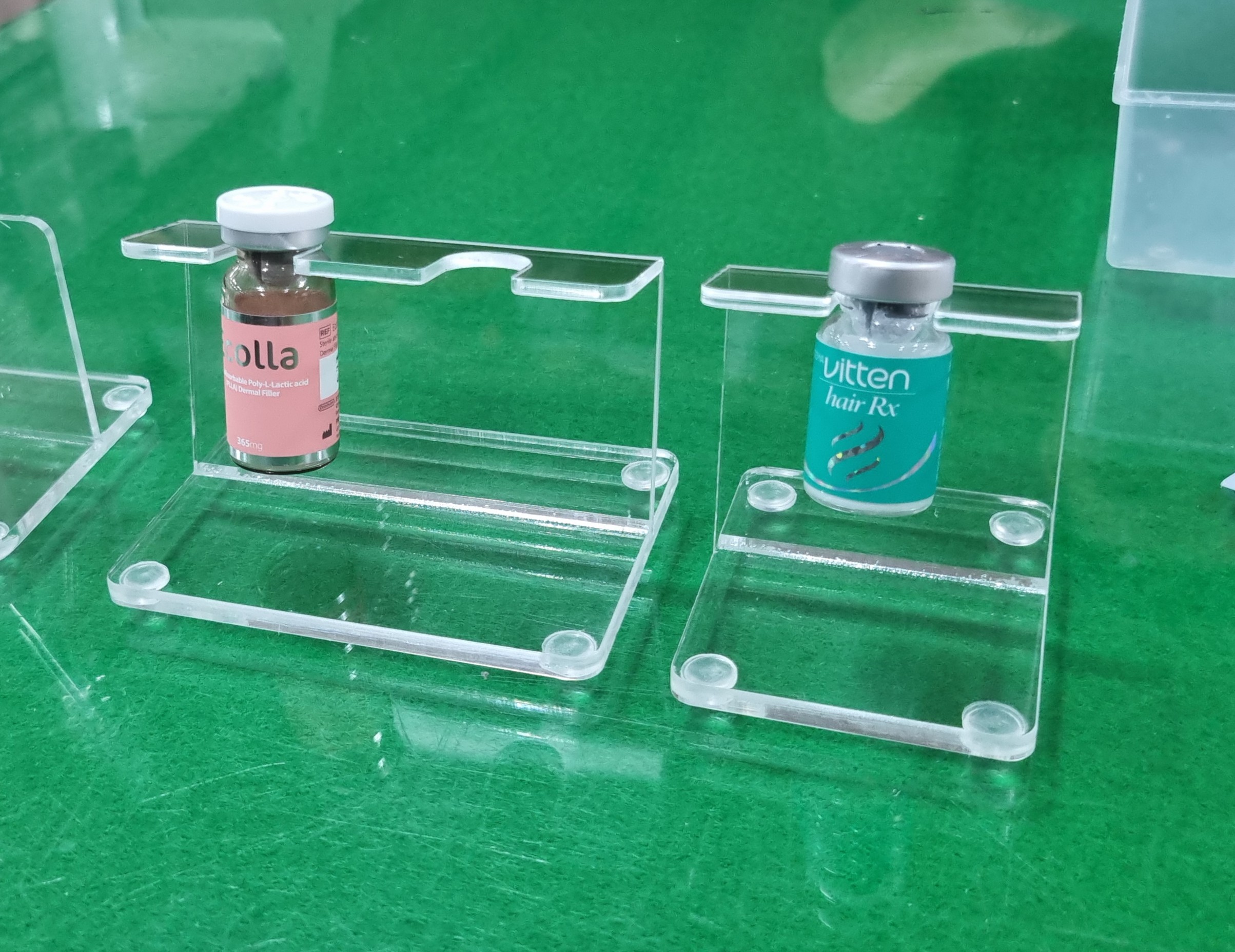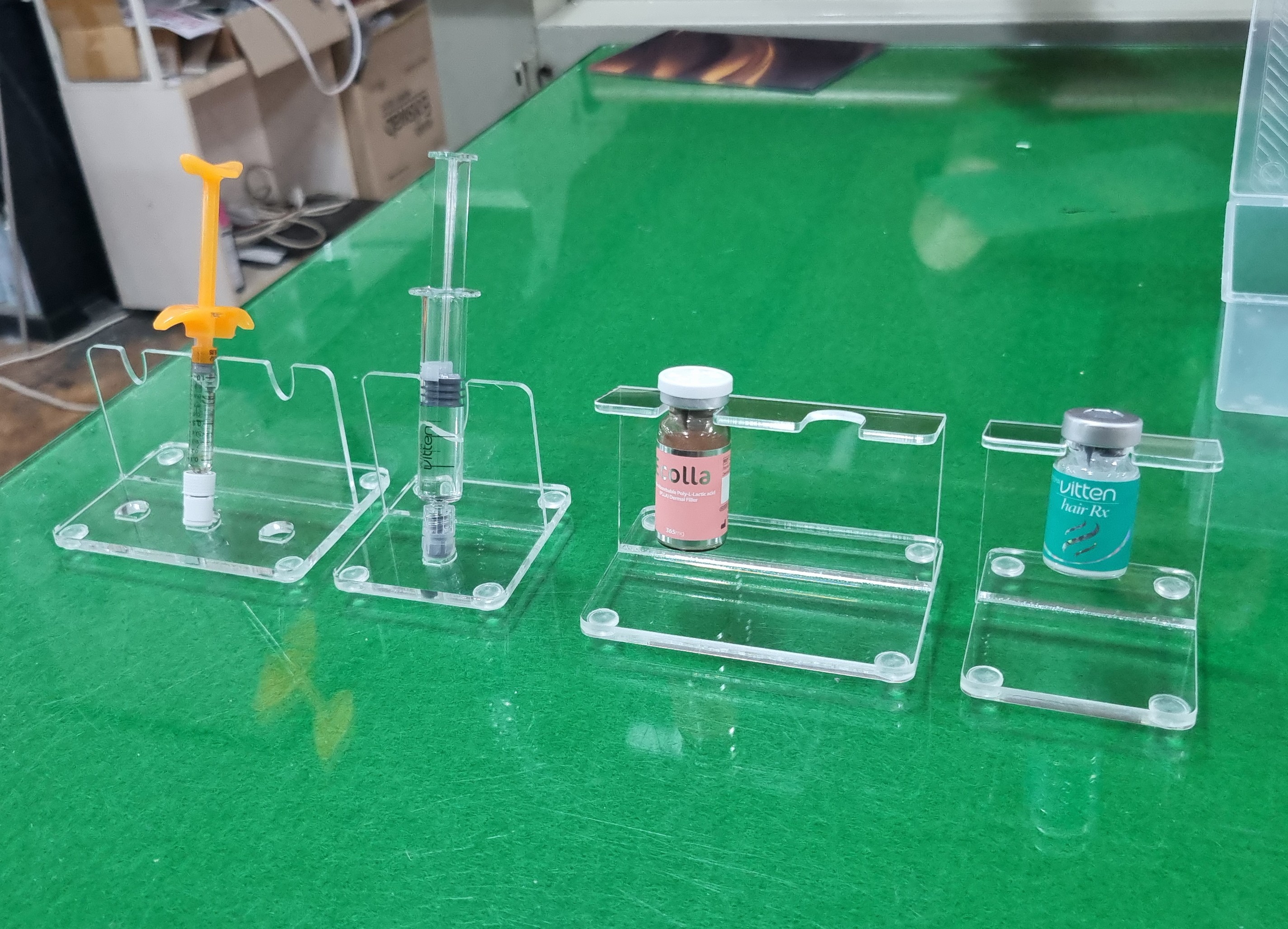 -제작 완료된 바이알, 시린지 아크릴 거치대 샘플 2종.
